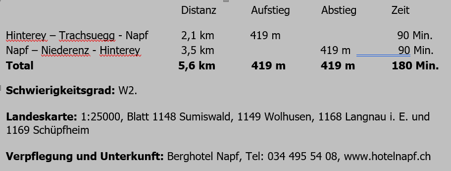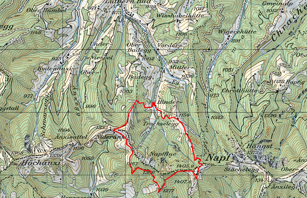 Für den Abstieg wählen wir den Westgrat an Grüeblihengst, Napf- und Eyflue vorbei zur Alp Niederenzi. Der Weg weist südlich des Grüeblihängst vorerst zum Grat zwischen Hütte- und Fankhusgrabe hin. Hat man diesen bei einer kleinen Waldlichtung schliesslich erreicht, muss man sich wieder gegen Norden der Napfflue zuwenden, will man nicht auf der falschen Seite des Napfs absteigen.