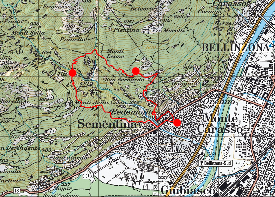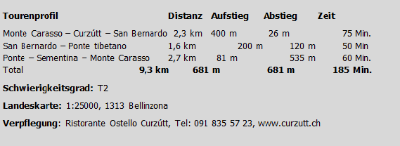 Wir wenden uns gegen Norden, überschreiten die Kantonsstrasse und folgen der Gasse in Richtung der von weitem sichtbaren, auf einem Felsen über dem Dorf stehenden Kirche SS. Trinita. Dort beginnt der alte befestigte Bergweg nach Curzútt und San Bernardo hinauf. Am Fuss des Kirchfelsens stossen wir auf die mächtige Talsprerre, die früher die gesamte Ebene bis hinüber zu den drei grossen Festungen von Bellinzona gegen Süden abgeriegelt hat. Wir folgen dem alten Saumweg nach San Bernardo zu den letzten Reben beim Weiler Lòri und überqueren dabei dreimal ein Fahrsträsschen. Beim Wasserreservoir biegen wir nach Osten ab und steigen über Tizott zum unteren Teil von Curzútt auf. Hier besteht die Möglichkeit zur Einkehr im Ristorante Ostello Curzútt, das in vorbildlich renovierten alten Häusern auch die Möglichkeit zum Übernachten in Vier- und Achtbettzimmern anbietet.