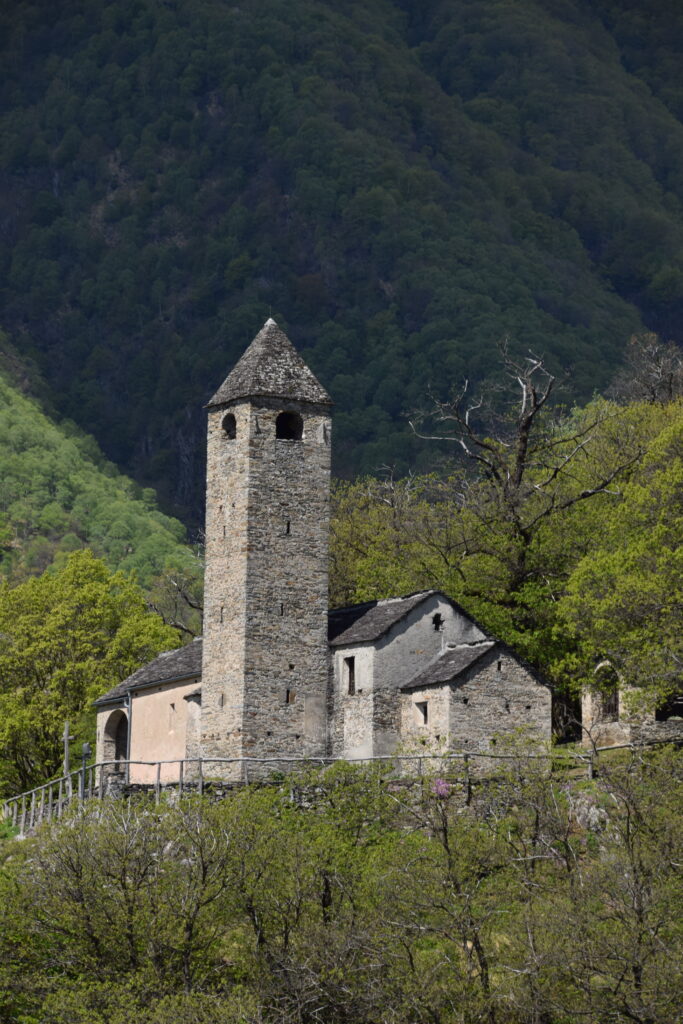 Der Weiterweg bringt uns kurze Zeit später gegen Westen zur Kirche San Bernardo. Der Schlüssel für die Kirche kann ausserhalb der Öffnungszeiten im Ristorante von Curzútt bezogen werden. Bergwärts der Kirche stehen das alte Pfarr- und Beinhaus. Für Friedhöfe wurde in früheren Zeiten nur wenig Boden geopfert, weshalb regelmässig alte Gräber für neue aufgelöst werden mussten. Die Knochen der Toten wurden in Beinhäusern untergebracht, im vorliegenden Fall in der darunter liegenden Grabkammer, die mit einer runden Steinplatte geöffnet werden konnte.