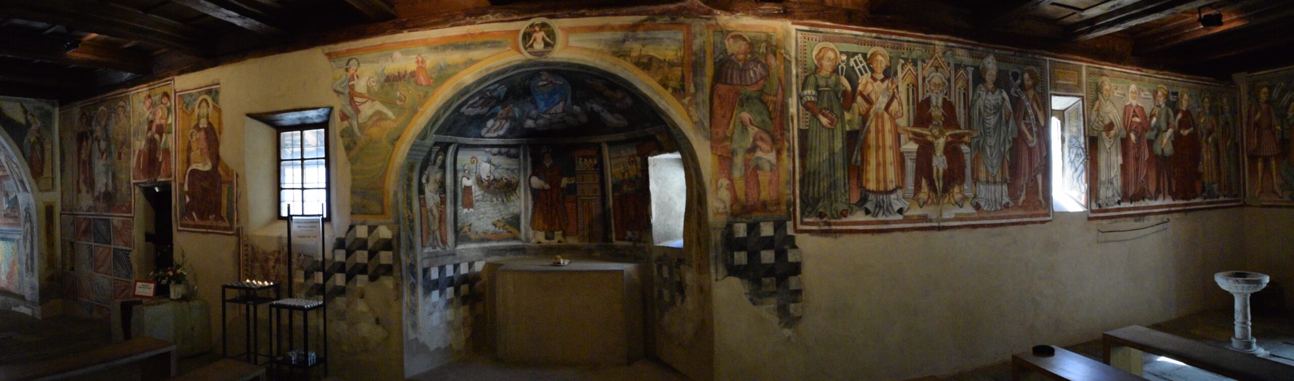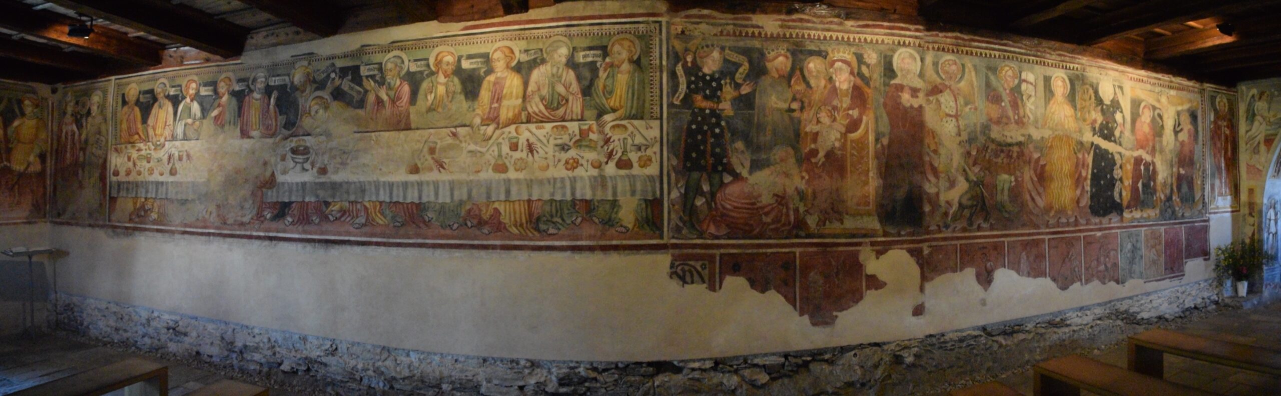 Die zwischen dem 11. und 12. Jahrhundert entstandene Kirche ist San Bernardo geweiht und hat bis zum Beginn des 17. Jahrhunderts mehrere Um- und Anbauten erfahren (Abb. 1). Die ältesten Fresken, wie die Madonna del Latte und der Christophorus an der südlichen Aussenwand stammen aus der zweiten Hälfte des 13. Jahrhunderts, die Darstellungen an der ursprünglichen Nordwand mit der Anbetung der drei Könige, der Kreuzigungsszene und dem Monatszyklus darunter aus der ersten Hälfte des 15. Jahrhunderts. Die Fresken, die nach der Kirchenerweiterung in der zweiten Hälfte des 15. Jahrhunderts entstanden sind, werden der berühmten Malerdynastie der Seregnesi aus Lugano zugeschrieben. Dazu gehört auch die bewegende Darstellung des letzten Abendmahls. Die jüngsten Fresken aus der Renaissance und dem Barock entstanden im Bereich der letzten Umbauten, also in der San Nicolao gewidmeten Kapelle auf der Südseite sowie im Chor im Osten (Abb. 2).2