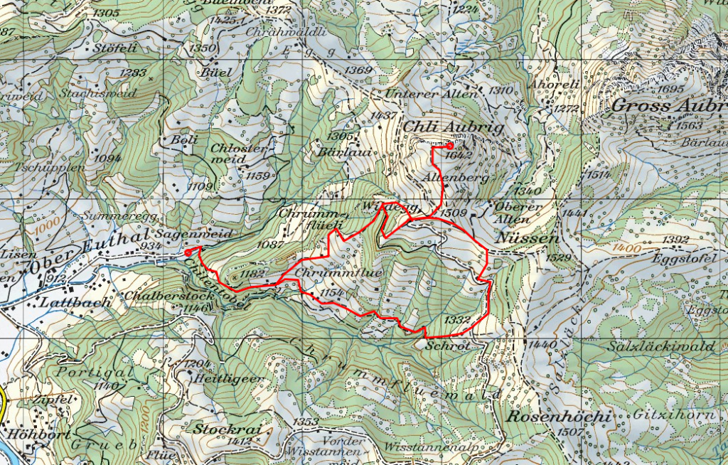 Der übliche Aufstieg zum Chli Aubrig erfolgt von der Vorder Sattelegg aus, also der Passstrasse, die Willerzell am Sihlsee mit dem Wäggital verbindet. Eine interessantere, aber weniger bekannte Route führt von dem etwas südlicher am Sihlsee gelegenen Euthal zum Gipfel. Am Ende der Fahrstrasse in das gleichnamige Seitental beginnt die Wanderung. Wir überschreiten östlich des Weilers Sagenweid den vom Chli Aubrig herunterfliessenden Bach gegen Süden. In einigen engen Wegkehren erreichen wir am Fusse der Chrummflue eine langgezogene Waldlichtung. Die Felswand der Chrummflue wird durch das Chilentobel umgangen. An dessen östlichem Ende gelangen wir zu den Häusern und Weiden der Vorder Chrummflue, wo sich der Weg teilt.