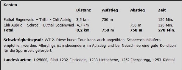 Im Abstieg ist die Wildegg wie im Flug erreicht. Von hier aus folgen wir etwa 400 Meter dem Gratweg gegen Osten, um noch vor Erreichen der Nüssen weglos den Hang gegen Südwesten zu einem einsam stehenden Heuschober abzusteigen. Dort gelangen wir auf die Alpstrasse, die von der Wildegg nach Schrot hinunterführt. Bei Schrot verlassen wir die Strasse wieder und steigen gegen Westen, an den Häusern vorbei, zum Waldrand ab. Hier erfordert das Auffinden des schmalen Weges durch die Schrotruns hinunter zur Hinter und Vorder Chrummflue vor allem bei viel Schnee etwas Aufmerksamkeit. Auf Vorder Chrummflue finden wir wieder zur Aufstiegsspur und nach kurzer Zeit ins Euthal zurück (Abb. 5).
