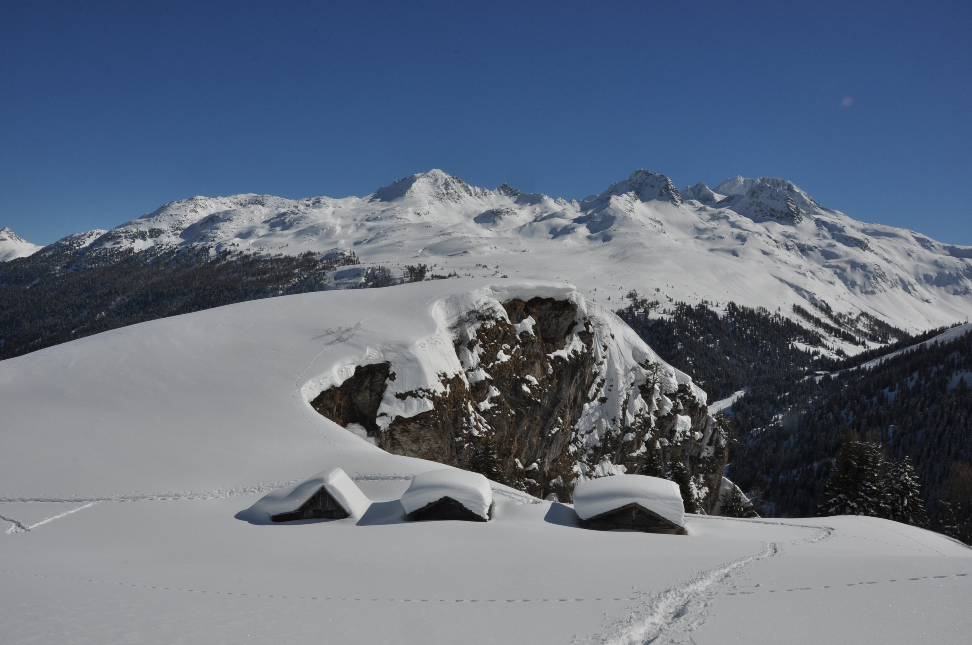 Unsere erste kleinere Schneeschuhtour beginnt gleich vor der Haustür. Wir verlassen Splügen zu oberst im Dorf durch einen kleinen Torbogen in der Häuserfront und folgen dem alten Weg zum Safierberg steil den Hang auf der Westseite des Stutzbaches hinauf. Bei den ersten Stadeln legt sich der ebenfalls Stutz genannte Hang etwas zurück. Da der Aufstieg zur Stutzalp eine beliebte Route für Skitourenfahrer ist, liegt meist schon eine Spur, von der man bis zu den obersten Stadeln oder eben Gaden von Gadastatt profitieren kann. Hier wenden wir uns genau gegen Süden und queren den Hang in Richtung der Senke nordwestlich des Fluegrinds. Gleich hinter dieser stehen drei Alphütten, auf deren Dächer hohe Schneedecken lasten. Die Seitenmauern sind vollständig unter dem Schnee begraben (Abb. 1). Hier halten wir unsere Mittagsrast und geniessen die warme Sonne, die uns während des ganzen Aufstiegs begleitet hat.