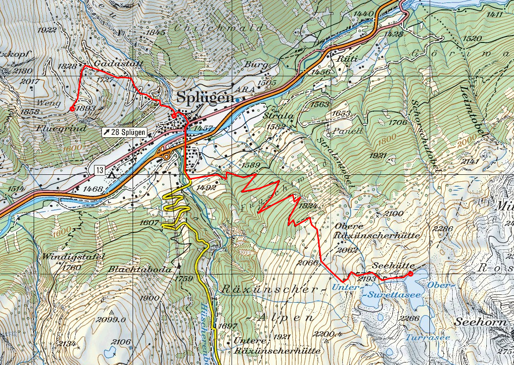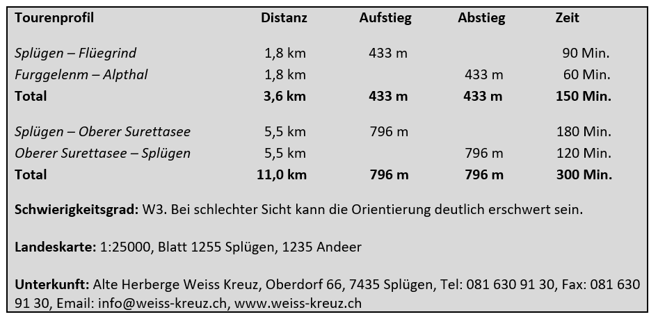 Der nächste Tag führt uns zu den Surettaseen im Südosten von Splügen. Wir folgen der Passstrasse zum Splügenpass bis zu ihrer ersten scharfen Rechtskurve. Am Dorfausgang steht noch der mit einem Vordach versehene alte Grenzposten, der heute von der Bündner Kantonspolizei genutzt wird. Über eine gut gespurte Waldstrasse gelangen wir gegen Osten in den Fugschtwald. Noch vor der zweiten Bachrunse, die die Grenze eines Wildschutzgebietes bildet, in dem jegliche Ausübung von Sport verboten ist, zweigt der Bergweg zu den Surettaseen ab, der in mehreren weiten Kehren gegen den Franzisch Grind zur Baumgrenze hinaufführt. Die Chancen stehen meist gut, dass bereits eine solide Spur gelegt ist, da dieser Aufstieg auch im Winter sehr beliebt ist, ohne überlaufen zu sein. Bei viel und neu gefallenem Schnee ist es nicht nur anstrengend, sondern auch nicht ganz einfach, die Trasse des Alpweges zu finden. Oberhalb der Baumgrenze quert man den weiten Schneehang in südsüdöstlicher Richtung gegen das Becken der Surettaseen nördlich der Surettahörner (Abb. 2 und 3). Es ist ratsam, die mit Triebschnee gefüllten Geländesenken zu meiden und die vom Wind kahlgefegten Felsrücken für den Aufstieg zu nutzen. Vom Unteren zum Oberen Surettasee, beide zugefroren und tief verschneit, muss nur noch ein kurzer Osthang überwunden werden. Leider ist die Seehütte am Ufer des oberen Sees verschlossen und finden wir selbst auf ihrer Leeseite keinen Schutz vor dem eisigen Südwind, der in wilden Wirbeln ganze Wolken von flirrenden Schneekristallen vor sich hertreibt, die uns bald mit einer feinen weissen Schicht bedecken. So ist unsere Rast zwar von kurzer Dauer, der herrliche Ausblick auf die Surettahörner direkt über uns und vom Piz Tambo über Zapporthorn und Adula bis hin zum Teurihorn hoch über Splügen wird deswegen aber in keiner Weise geschmälert. Kaum zu glauben, dass wir im letzten Sommer im oberen See geschwommen sind und ihn mit einem Ruderboot befahren haben. Für den Abstieg wählen wir erneut dieselbe Route. Da sich zahlreiche Abkürzungen anbieten und die Ausblicke auf Tal und Berge so verändert gegenüber dem Aufstieg erscheinen, wähnen wir uns wie auf einer neuen Route (Abb. 4).