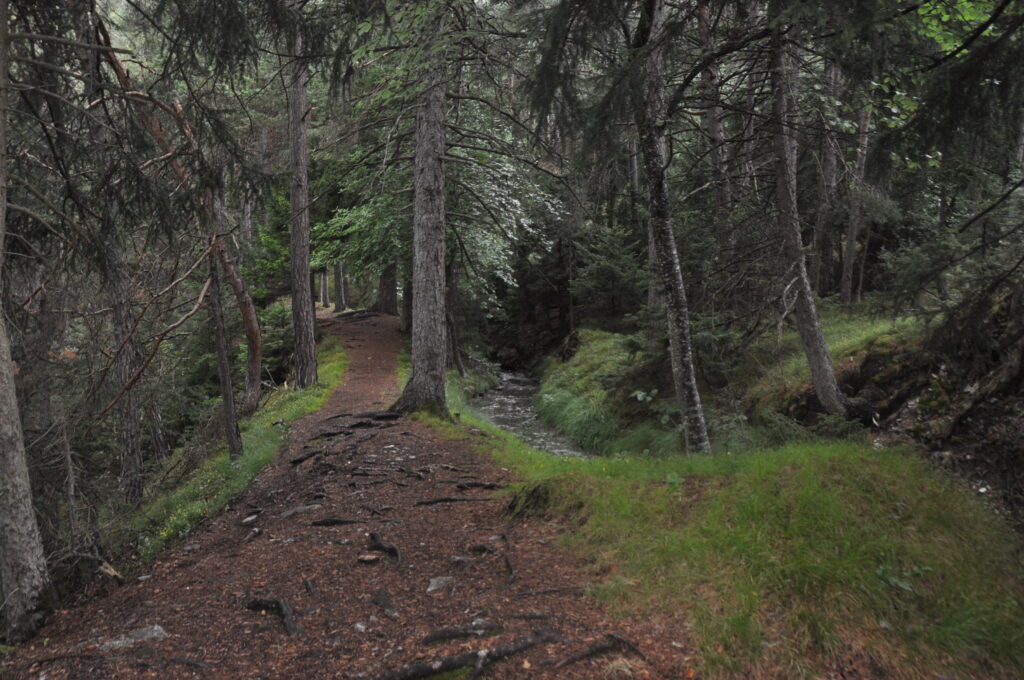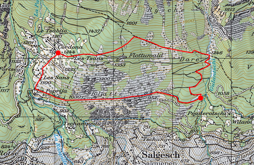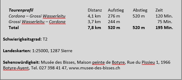 Bevor die Suone in die Schlucht der Raspille einbiegt, wo sie ihr Wasser fasst, nehmen wir die bergseitige Abzweigung, die uns in nordöstlicher Richtung über den Weiler Sans etwas steil nach Cordona zurückführt (Abb. 4). Ein zauberhafter Rundweg, der durch die Kargheit der Landschaft die Bedeutung der Suonen bewusst macht.