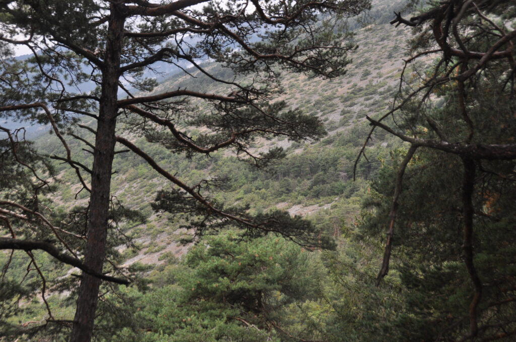 Nach knapp einer Stunde stossen wir auf den Bergweg, der von Varen zur Varneralp hinaufführt. Wir folgen diesem abwärts bis zum Bett des Gulantschibachs. Wir überschreiten diesen nicht, sondern wenden uns gegen Süden und erreichen nach kurzer Zeit über einen Zickzackweg die Grossi Wasserleitu. Dieser entlang queren wir auf einem beschaulichen Weg die spärlich bewaldete Blatte. Nur entlang der Suone konnte sich ein schmaler dichter Wald- und Buschgürtel bilden, der von weitem als gerade Linie im Hang erkennbar ist (Abb. 2 und 3). Zudem fällt auf, dass unterhalb der Wasserleite Flaumeichen die Föhren abgelöst haben. Letztere vermögen besser der enormen Sommerhitze zu widerstehen, die in Bodennähe bis zu 50° C erreichen kann. Weiter talwärts schweift unser Blick über das vielfältig gewebte Muster der Rebberge von Varen und Salgesch.