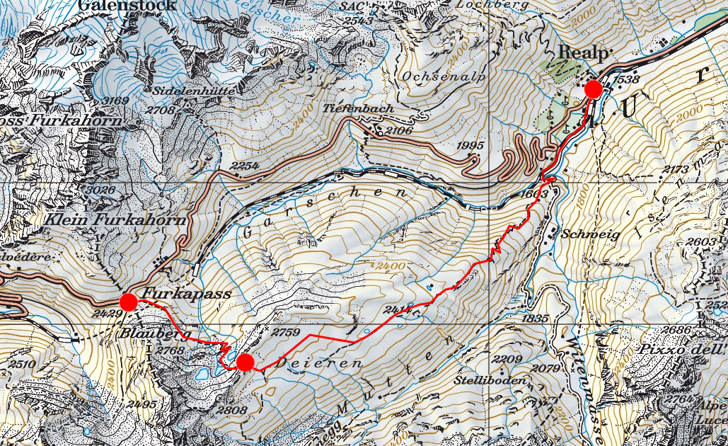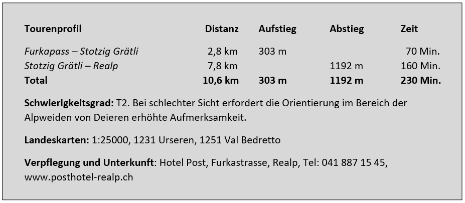 Unterhalb des Stotzig Grätli liegen drei Bergseen, die zu einer kurzen Rast einladen, bevor wir die letzten Meter bis zum gleichnamigen Passübergang gewinnen. Leider verwehren uns die Wolken noch den herrlichen Blick auf Klein und Gross Furkahorn sowie auf den Galenstock (Abb. 1). Dafür ist auf der anderen Seite des Übergangs die Sicht frei auf die Muttenhörner und das Gross Leckihorn. Hinter dem Muttenpass ist auch noch die Gipfelpartie des Witenwasserenstocks zu erkennen. Der ausgeaperte Muttengletscher wird in den kommenden Jahrzehnten wohl ganz verschwinden. Gegen Nordosten dehnen sich hoch über dem engen Einschnitt der Muttenreuss die weiten Alpweiden von Deieren aus.